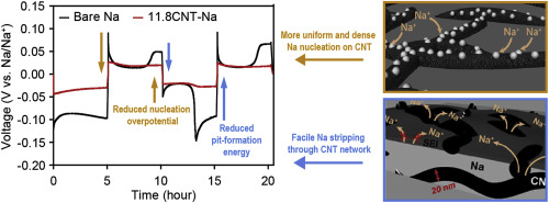 논문 해외 국제전문학술지(SCI급) Tuning sodium nucleation and stripping by the mixed surface of carbon nanotube-sodium composite electrodes for improved reversibility