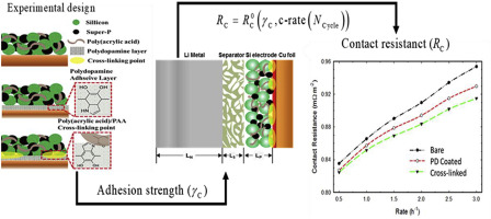 A coupled chemo-mechanical model which considers the contact resistance as well as the influence of the attractive forces inside the contact area between the electrode and current collector was developed to evaluate the effects of the adhesive strength of a binding material on the electrochemical performance of silicon-based lithium-ion batteries. The increase in contact resistance between the electrode and current collector was introduced as a factor that reduces the electrochemical performance of the cell. The model predictions were validated with experimental data from coin-type half-cells composed of Li metal, Si electrodes, and Cu current collectors coated with binding materials with different adhesive strengths. The contact resistance increased with an increasing number of cyclic current rate. The adhesive strength decreased with cyclic current rate. The proposed model was used to investigate the effects of adhesive strength and various cell design parameters on the specific capacity of the Si-based Li-ion cells.