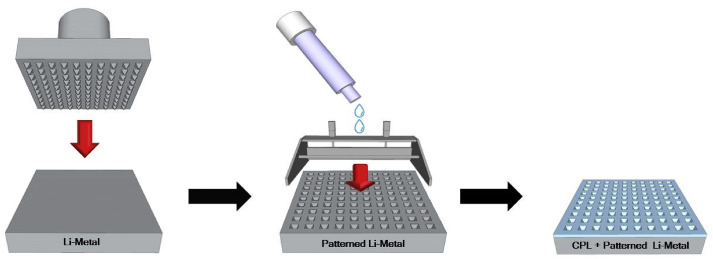 One possible way to increase the energy density of Li secondary batteries is to replace the commercialized carbonaceous anodes (such as graphite ones) with Li anodes due to their extremely high theoretical specific capacities, low densities, and lowest negative values of electrochemical potential. Despite these advantages of Li metal anodes, the uncontrolled deposition of dendritic, mossy, and granular Li particles decreases the Coulombic efficiency of Li batteries and causes various safety issues, which limits their scope of practical applications. To solve this problem, a surface-patterned Li metal anode covered with an alumina-based composite protection layer is developed in this work. Subsequently, the composite protection layer composition is optimized, and the electrochemical properties of the resulting micro-patterned Li metal anode are investigated. Due to the existence of a synergistic effect between the surface-patterned Li metal anode and the composite protection layer coating, the deposition of Li ions is effectively controlled, which prevents the formation of dendritic, granular, and moss-like Li particles after multiple deposition cycles even at relatively high current densities (up to 2.4 mA cm−2).