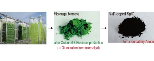 We introduce a novel approach for the high-value production of nano/micro hierarchical structured Sn anodes for lithium-ion batteries (LIBs) by utilizing microalgal biomass residues that collaterally form during oil extraction for biofuel production. The Sn/C composites made from the oil-extracted microalgal biomass residues (the extracted Sn/C) exhibit the following advantages as high-energy-density anodes: 1) a homogeneous distribution of Sn nanoparticles in the carbon matrix (Sn/C), which efficiently relieves the strain caused by volume changes of the active materials; 2) a high porosity of Sn/C composites; and 3) a homogeneous distribution of the hetero elements N and P in the carbon matrix. Overall, the extracted Sn/C exhibit improved electrochemical performance in LIBs compared with the Sn/C composites made from the microalgal biomass residues without oil extraction (non-extracted Sn/C). The extracted Sn/C have improved rate capabilities (160.0 and 72.9 mAh g−1 for the extracted Sn/C and the non-extracted Sn/C, respectively, at the 80th cycle, 3.5 A g−1) and improved cycle performances (511.7 and 493.2 mAh g−1 for the extracted Sn/C and the non-extracted Sn/C, respectively, at the 300th cycle, 200 mA g−1).