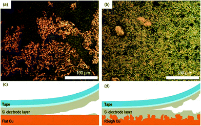 Two types of Cu foil, conventional flat Cu foil and rough Cu foil, are used to fabricate silicon (Si) electrodes for flexible and high-energy-density lithium-ion batteries (LIBs). Confocal microscopy and cross-sectional SEM images reveal the roughness of the very rough Cu foil to be approximately 3 μm, whereas the conventional flat Cu foil has a smooth surface and a roughness of less than 1 μm. This difference leads to the improvement of the interfacial adhesion strength between the Si electrode and the Cu foil from 89.7 (flat Cu foil) to 135.7 N m−1 (rough Cu foil), which is measured by a versatile peel tester. As a result, the Si electrode with high Si content (80 wt%) can deliver a significantly higher discharge capacity of 1500 mA h g−1 after 200 cycles, even at a current rate of 1200 mA g−1. Furthermore, when the corresponding Si electrode is assembled into a pouch-type cell and cycled in the rolled conformation with a radius of 6.5 mm, the Si electrode with rough Cu foil shows a stable cycle performance due to better interfacial adhesion.