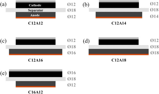 The effects of cathode/anode area ratio on the electrochemical performance of lithium-ion batteries are investigated using 2032-type coin full cells. As the anode area is increased from 1.13 (ø12 mm) to 2.54 cm2 (ø18 mm) while maintaining the cathode area as 1.13 cm2 (ø12 mm), both coulombic efficiency and discharge capacity at the first formation step become increasingly worse, probably owing to greater formation of solid electrolyte interphase (SEI). Moreover, rate capability also declined with increased anode area, whereas discharge capacity retention behavior during 1C/1C charge/discharge cycling appeared similar except for a slightly decreased capacity of coin cells with larger anode areas. The findings indicate that cathode/anode area ratio should be carefully evaluated to achieve reliable data on electrochemical performance.