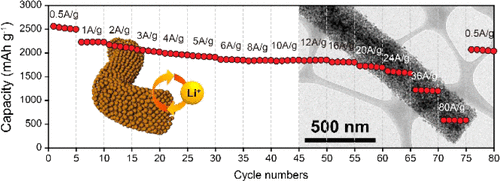 Mesoporous silicon nanofibers (m-SiNFs) have been fabricated using a simple and scalable method via electrospinning and reduction with magnesium. The prepared m-SiNFs have a unique structure in which clusters of the primary Si nanoparticles interconnect to form a secondary three-dimensional mesoporous structure. Although only a few nanosized primary Si particles lead to faster electronic and Li+ ion diffusion compared to tens of nanosized Si, the secondary nanofiber structure (a few micrometers in length) results in the uniform distribution of the nanoparticles, allowing for the easy fabrication of electrodes. Moreover, these m-SiNFs exhibit impressive electrochemical characteristics when used as the anode materials in lithium ion batteries (LIBs). These include a high reversible capacity of 2846.7 mAh g–1 at a current density of 0.1 A g–1, a stable capacity retention of 89.4% at a 1 C rate (2 A g–1) for 100 cycles, and a rate capability of 1214.0 mAh g–1 (at 18 C rate for a discharge time of ∼3 min).