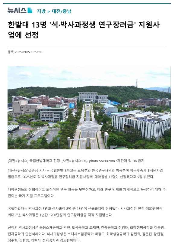 [2025.08] 2025 이공계 석사과정생 연구장려금 선정