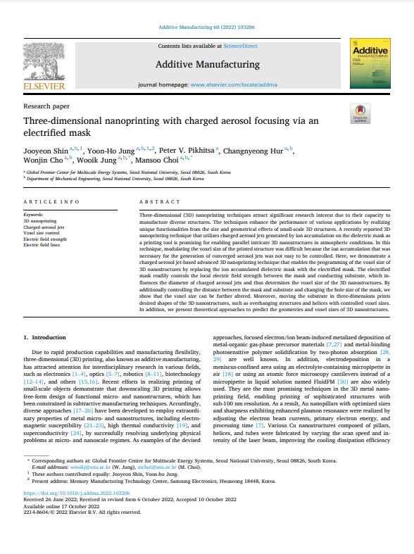 [Additive Manufacturing] Three-dimensional nanoprinting with charged aerosol focusing via an electrified mask