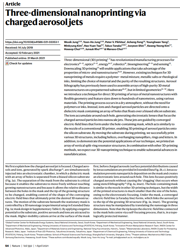 [Nature] Three-dimensional nanoprinting via charged aerosol jets
