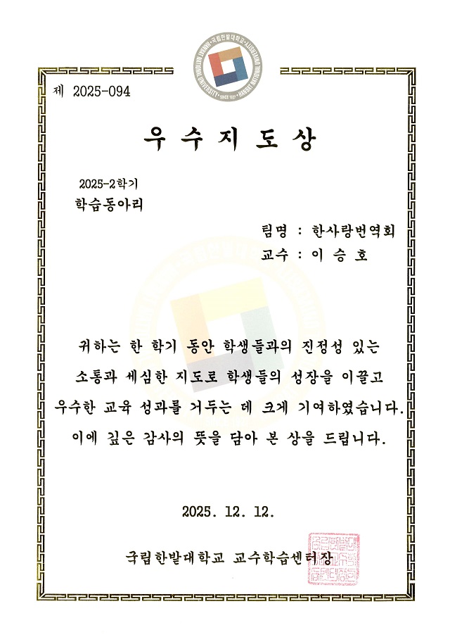 2025년 국립한밭대학교 우수지도상 수상