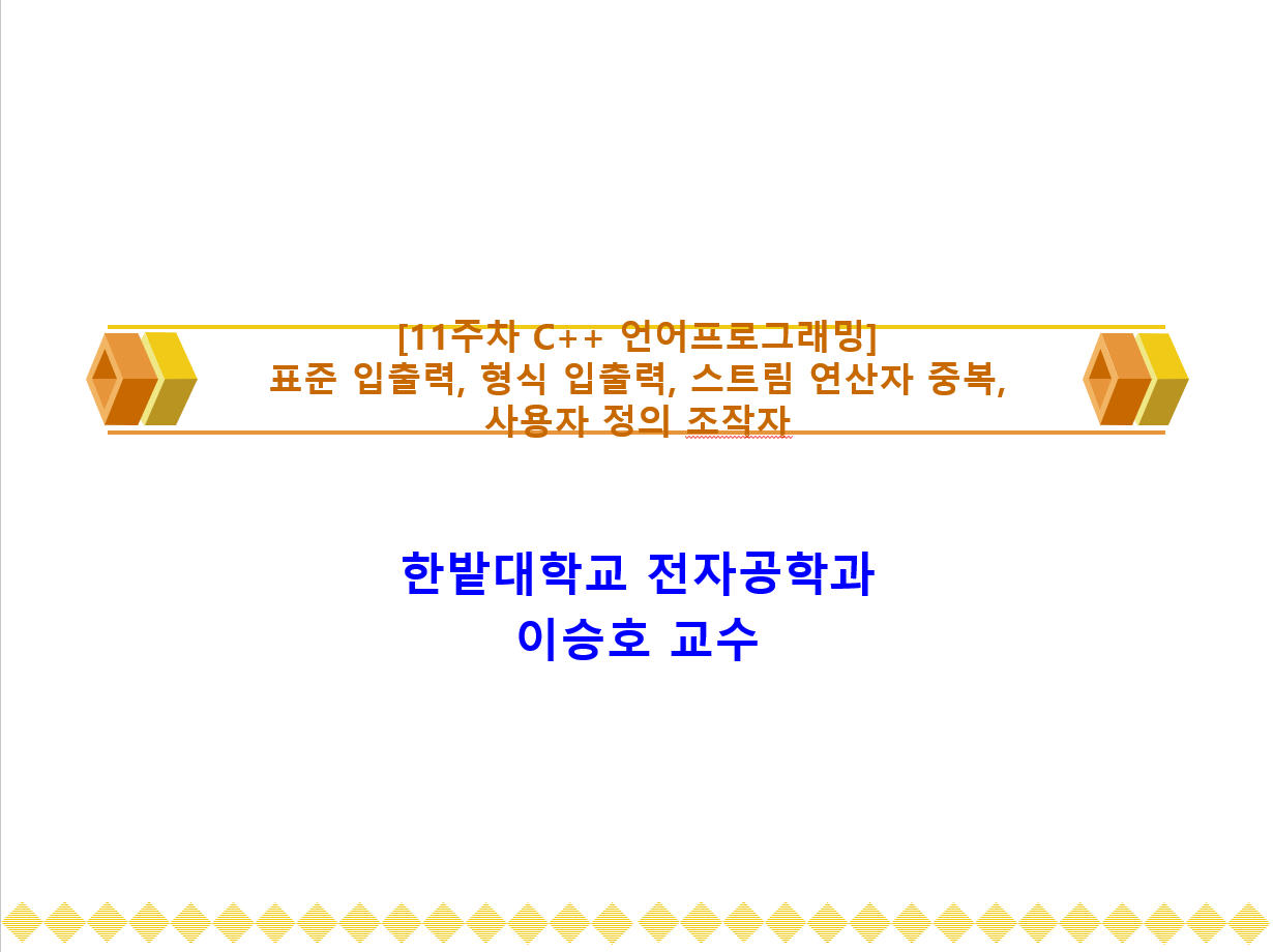 [11주차 C++ 언어프로그래밍]표준 입출력, 형식 입출력, 스트림 연산자 중복, 사용자 정의 조작자.pptx (2.12 MB)