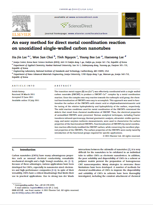 논문 국내 국제전문학술지(SCI급) An easy method for direct metal coordination reaction on unoxidized single-walled carbon nanotubes