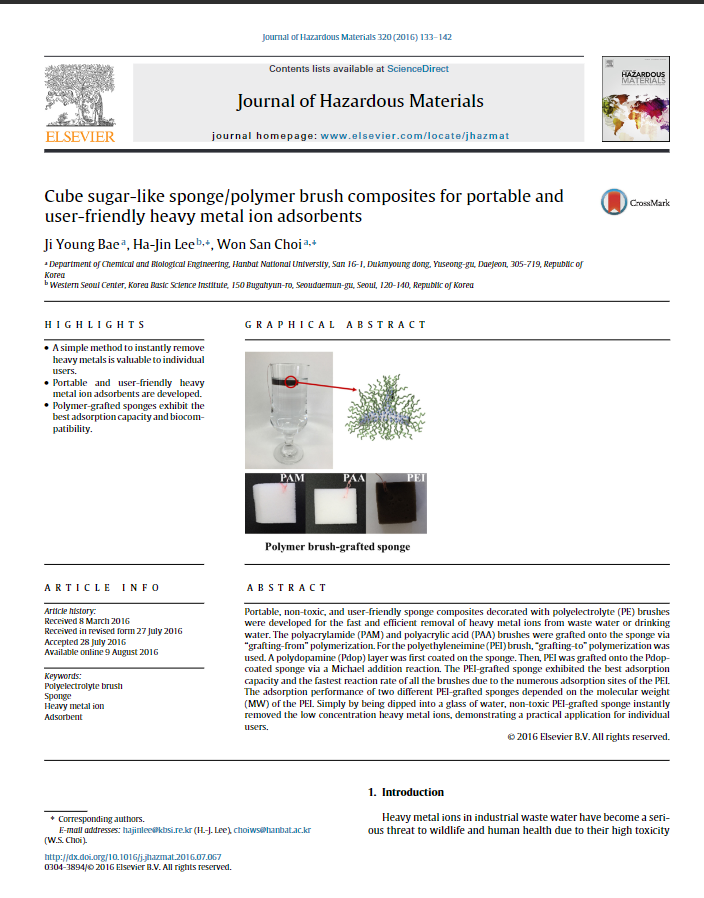 논문 국내 국제전문학술지(SCI급) Cube sugar-like sponge/polymer brush composites for portable anduser-friendly heavy metal ion adsorbents