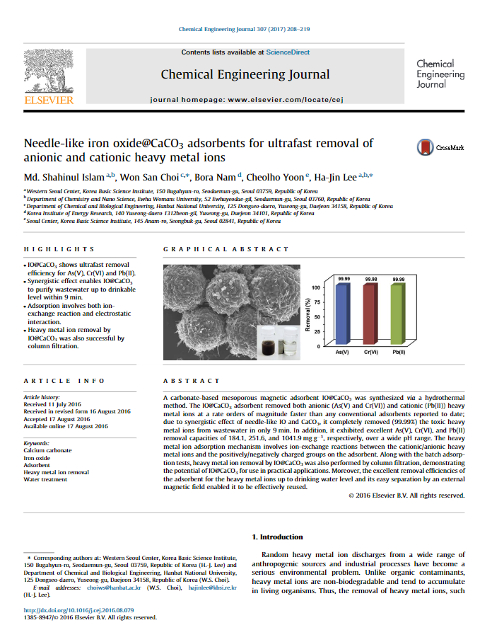 논문 해외 국제전문학술지(SCI급) Needle-like iron oxide@CaCO3 adsorbents for ultrafast removal of anionic and cationic heavy metal ions