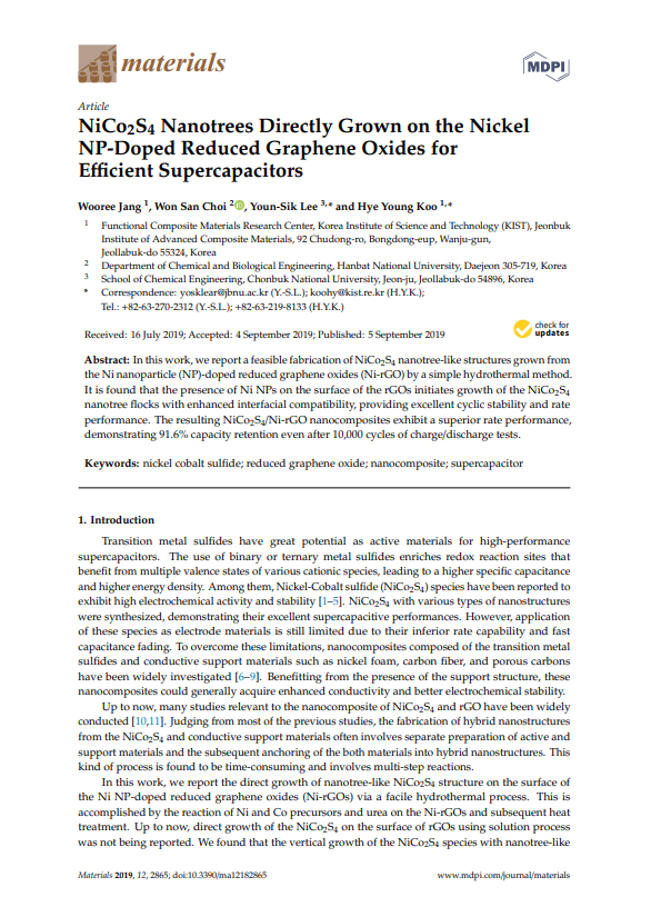 논문 해외 국제전문학술지(SCI급) NiCo2S4 Nanotrees Directly Grown on the Nickel-Doped Reduced Graphene Oxides for Efficient Supercapacitors